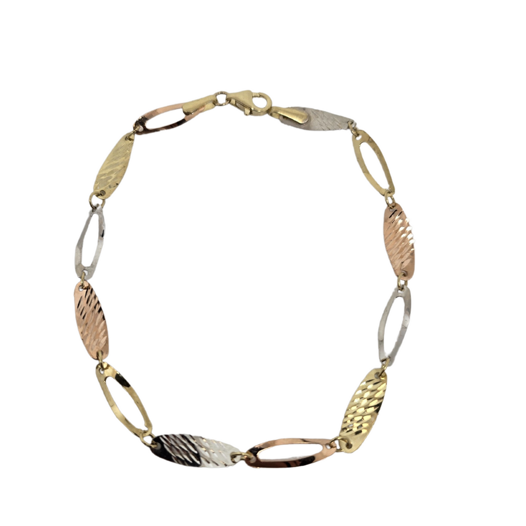 Embrace the beauty of nature with the “Golden Bloom” bracelet, crafted in 10K tri-color gold featuring delicate golden leaf designs. This piece combines the warmth of yellow, white, and rose gold in perfect harmony, creating a stunning reflection of elegance and femininity. Wear the essence of nature, radiate elegance, and let your style bloom in vibrant gold.